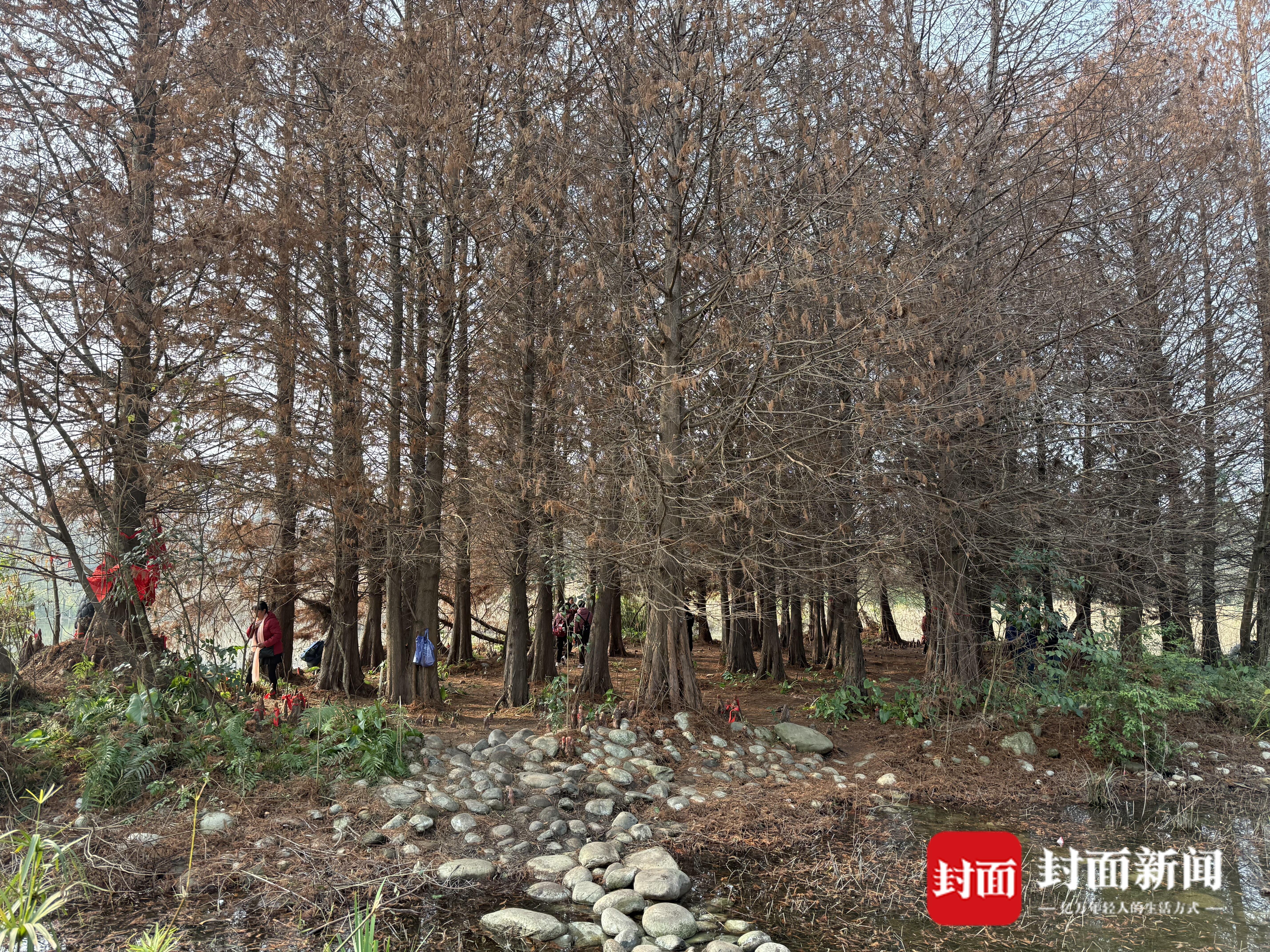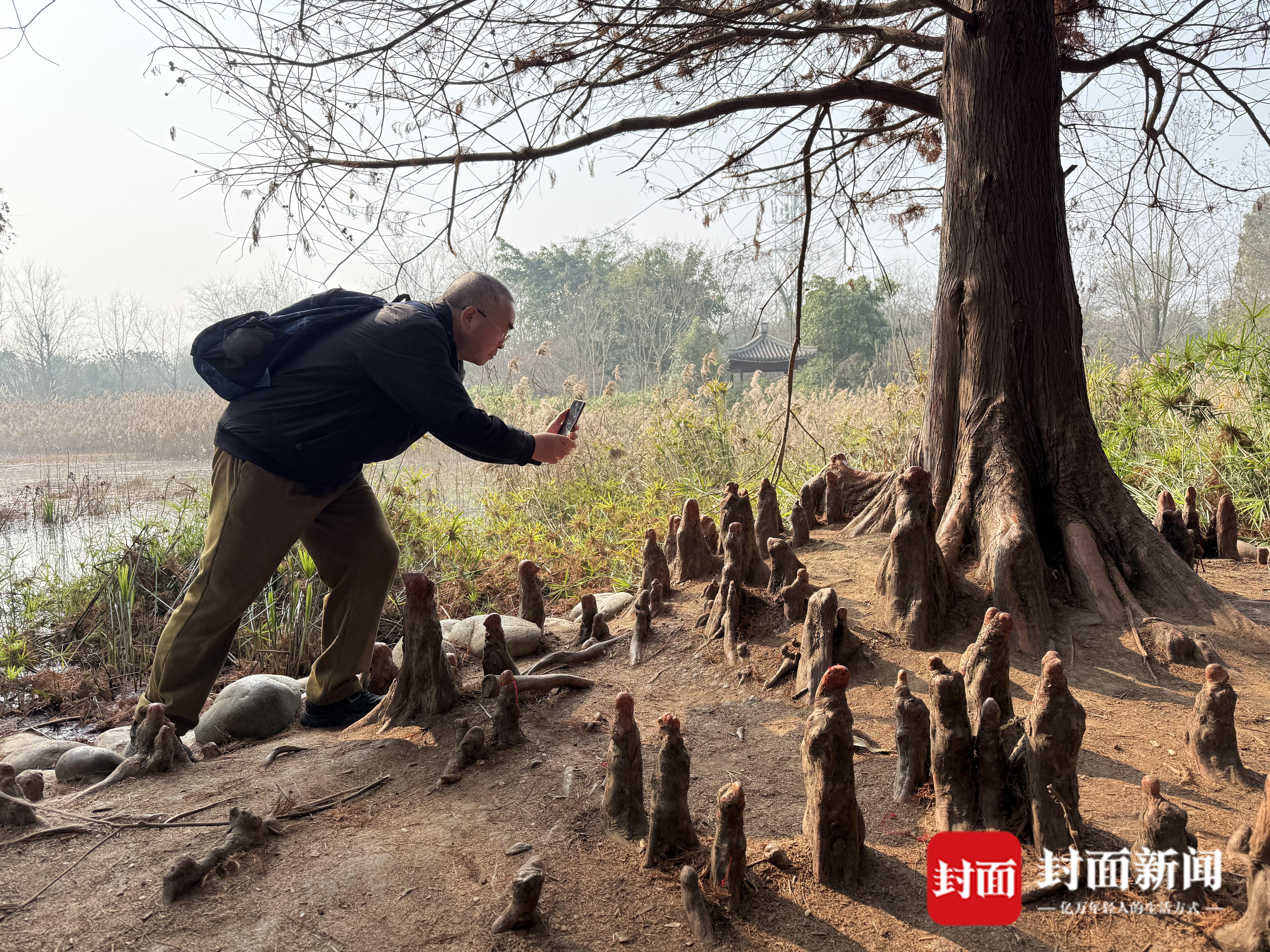 12日上午,记者来到青龙湖湿地公园,按照网友标记的位置,步行20多分钟,找到了这片“神仙树”。这片树林靠近水边,走进去,数十名游客围在一起,观察地面上冒出的一片树根,并拍照、合影。